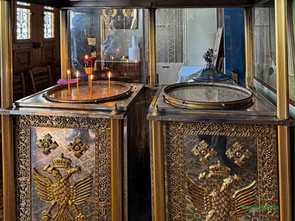 There were several of these locked, grated grottoes around the outside of the church with lighted votive candles inside them.