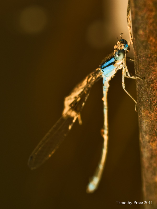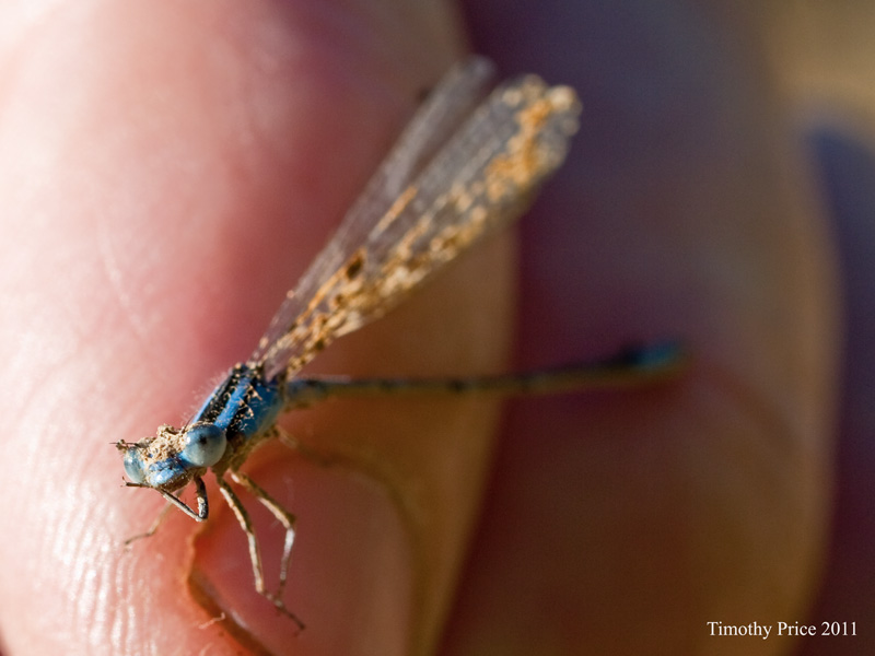 When I went out to shut off the water there was a damselfly covered with mud on the edge of the gate. It couldn’t fly and a spider was going for it. I picked it up and carefully rubbed some of the mud off it’s wings. It flew a little, decided it was still too had to fly, flew back and landed on my finger. I rubbed a little more dirt off its wings, then photographed it while it worked on getting the mud off it’s head. It took another test flight, flew back to my finger and I again worked on rubbing mud off its wings, while it scraped it off its head. We finally removed enough mud that it flew off toward the rising sun.