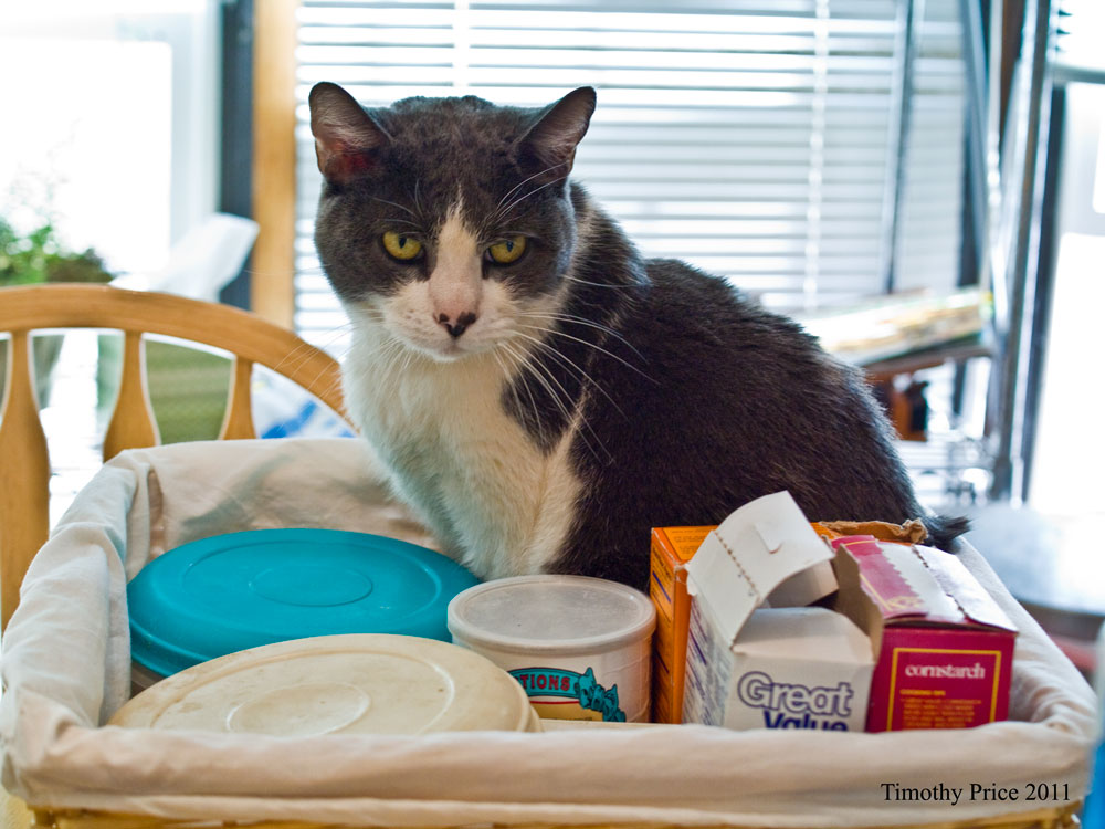 If you put down a box or a basket, a cat materializes in it instantly. We pulled down the basket we keep flour, sugar, etc, in, pulled out the flour and Stretch appeared instantly where the flour container was. I think cats have figured out Star Trek’s transporter — Rosencrantz seems to beam himself through walls.