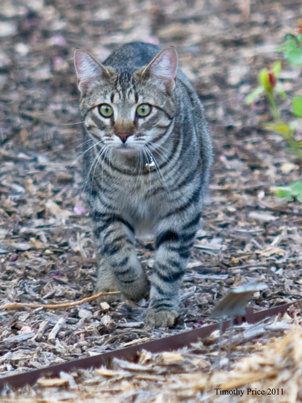 We had an infestation of cats tonight. Both the neighbor’s cats were over, plus the other black cat that’s been hanging around. Lola, their little black cat, followed me around the garden tonight, and rubbed on me while I was doing photos, making it difficult to get anything in focus. When the neighbor’s tabby noticed I was photographing him, he started stalking me. He was confused because he doesn’t really trust me to get very close, but he could see Lola rubbing on me.