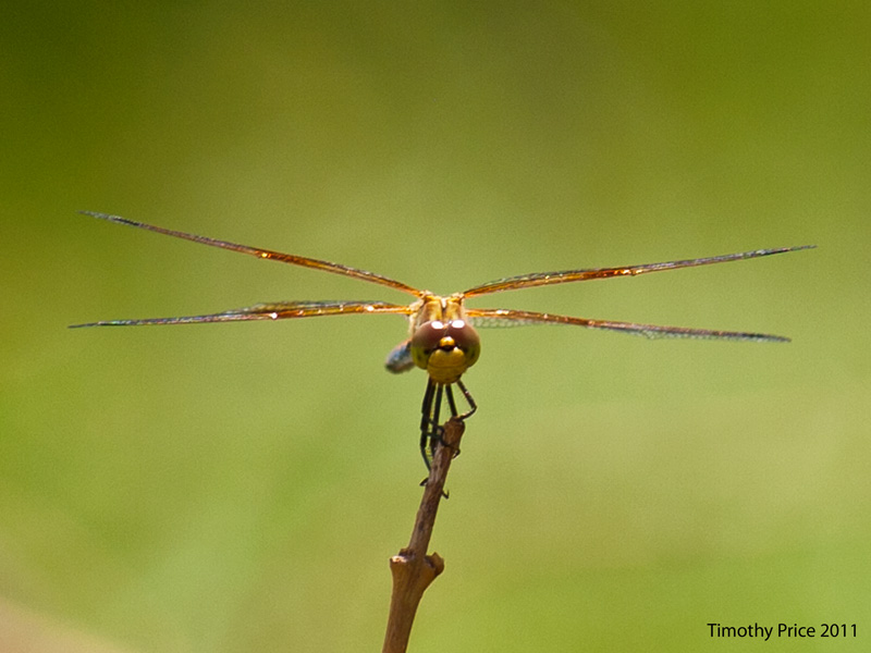 The yellow dragonfly in tonight’s set of photos would not let me near it with my macro lens, but it let me get to with in three feet of it with Le Long Lens. I got involved in working its photos because it had a very expressive face, and it’s a color I hadn’t photographed before.