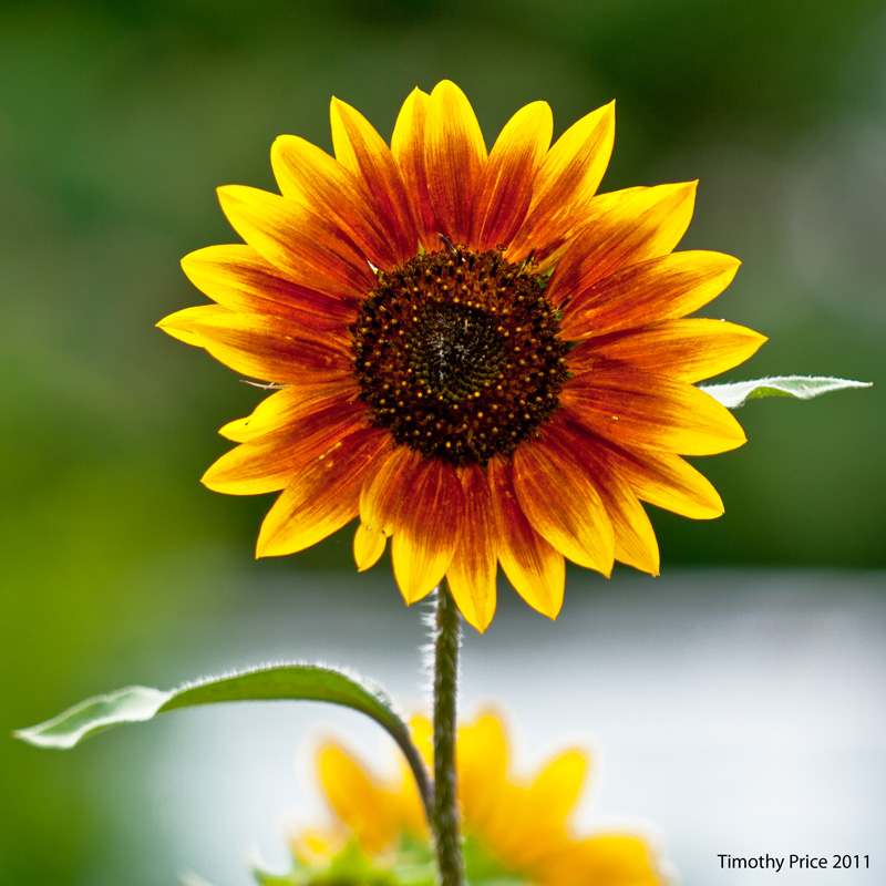We discovered a genetically modified sunflower in the garden. Those evil honeybees crossed a generic yellow sunflower with one of the hybrids that produce a large seed pod surrounded by small dark red petals. The results are small seed pods surrounded by larger petals that are reddish on the inside and yellow at the tips. The stalk is identical to the generic yellow sunflowers around it.