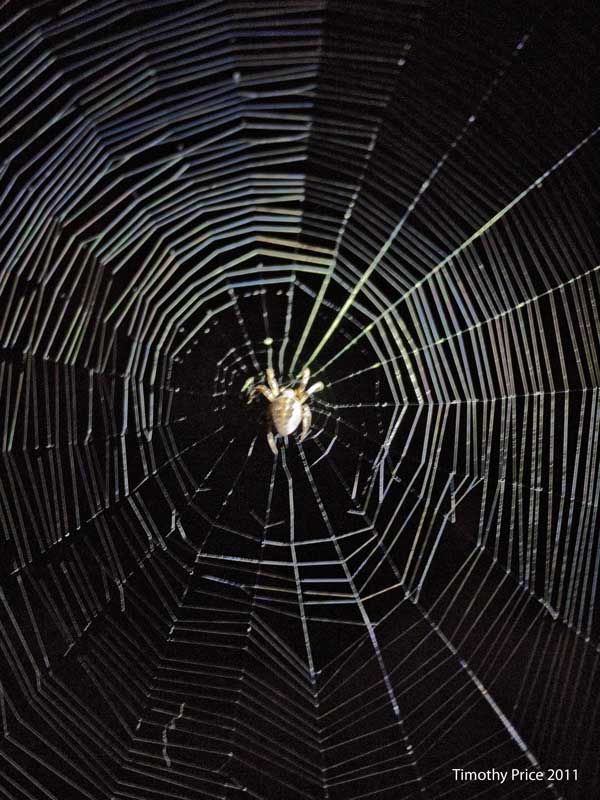 It’s 4:00 AM! Do you know where your arachnids are? This one built its web on the gate at the irrigation ditch, which I discovered when I went out to turn in the water at four this morning. The web was destroyed when I lowered the gate to dam the water. With each turn of the wheel, the web slowly collapsed until it disappeared once the gate was down. The poor spider held on till the last minute then dropped on a thread toward the water. I grabbed its thread and pulled the spider back onto the wheel —then I headed back to the house in the muted light of an overcast moon.