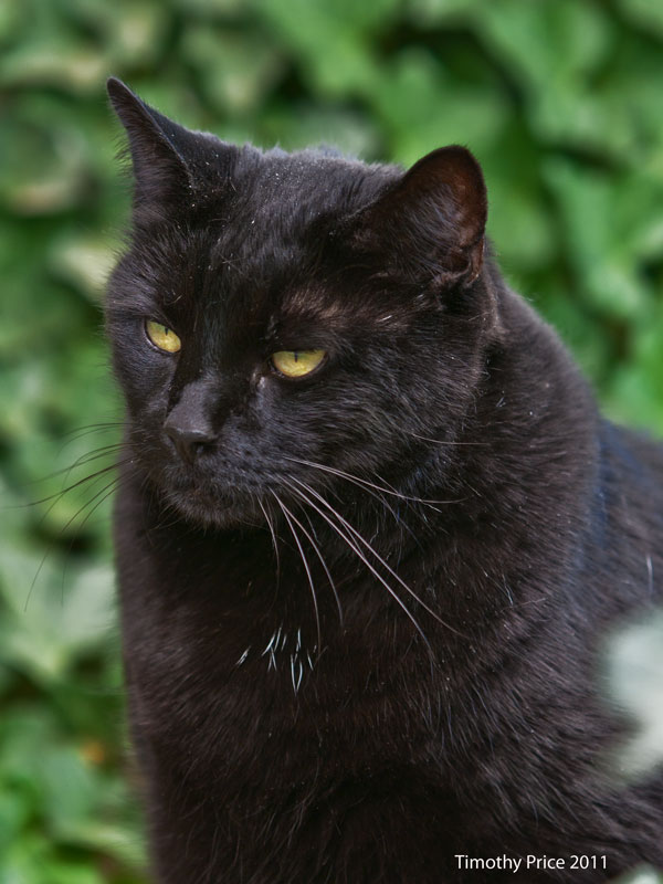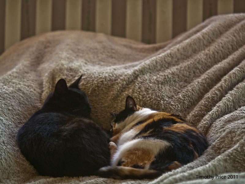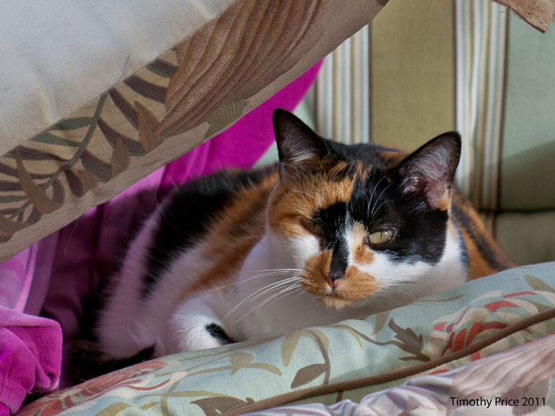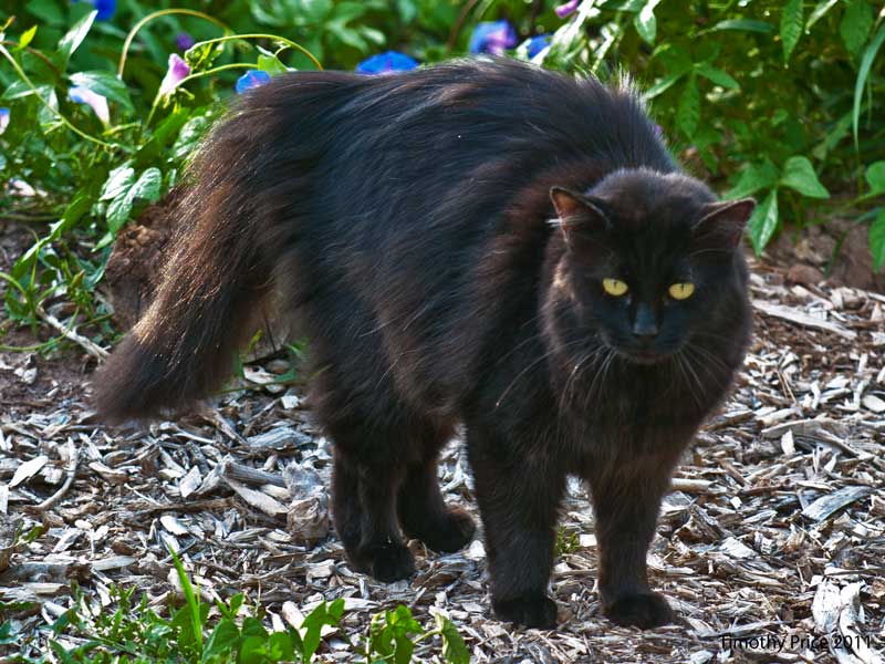 Kitties rule tonight on the photos. Rosencrantz and Diné like to snuggle up on the bed which is like a landscape with the “cat magnet” blanket covering all of our pillows. Guildenstern was pensive on the step, and Puck poofed when Rosencrantz and I walked around the corner of the house yesterday morning.
