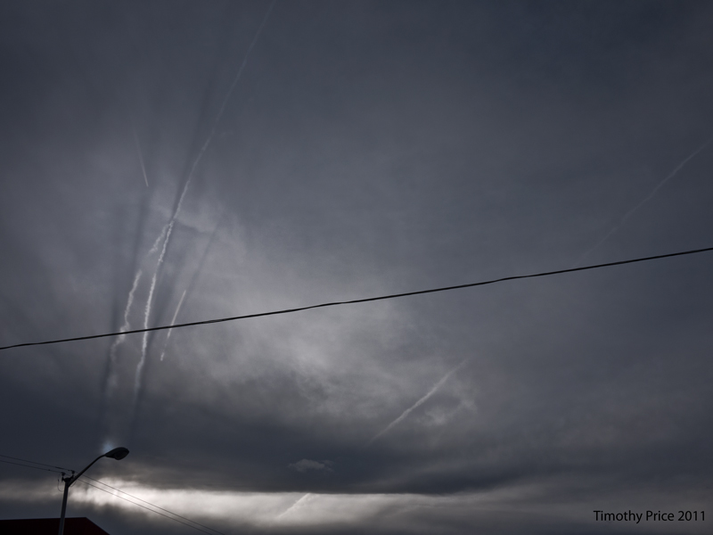 Scratches in the Clouds October 6, 2011 Timothy PriceLeave a comment The clouds looked like backlit paper that was scratched as we left UNM this afternoon. Puck posed in the roses, and I included the goldfish balloon from Sunday’s launch.