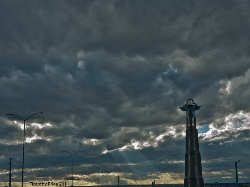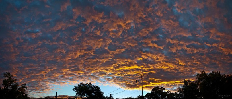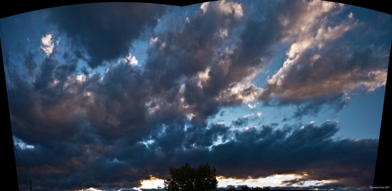 Dawn to Dusk October 7, 2011 Timothy PriceLeave a comment Dawn brought us a mottled sky, stirring the winds as she pushed the sun over the mountains. Winds blew the clouds by and by throughout the day, finally scattering them about the sky as Dusk calmed the winds, and the sun changed into twilight.