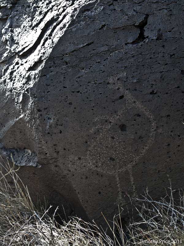 A few more petroglyphs and a view of the Sandias from on top of the escarpment below the volcanoes. These petroglyphs look recent to me, but what do I really know. It’s interesting how the holes in the rock are used to form the mouth. I assume the bird represents a turkey.