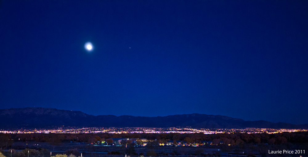Moonrise on Broadway November 10, 2011 Timothy Price3 Comments I got the moon rising over the light on Broadway just before the sunset on my way up to the university to pick up Laurie. Laurie snapped the moon rising over Albuquerque from the car when we were on Coors Road on our way home.
