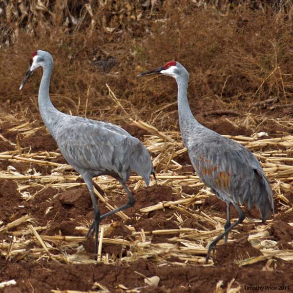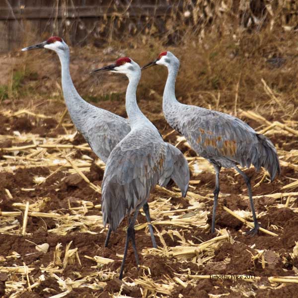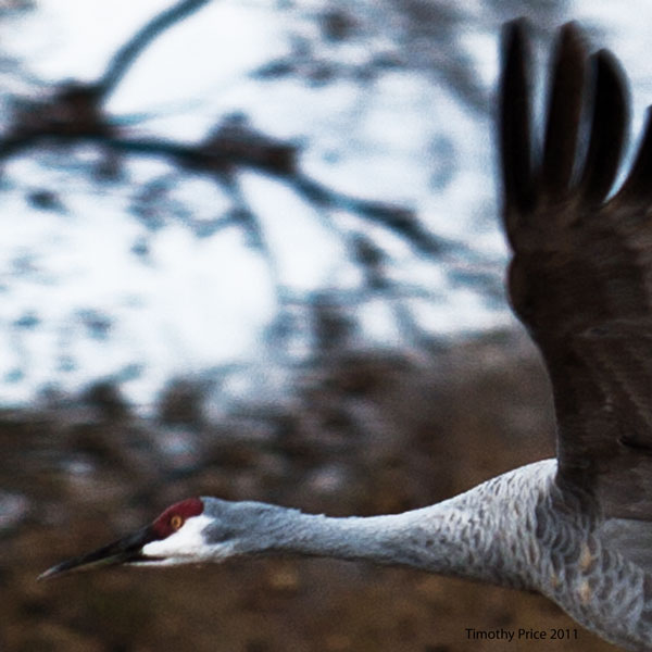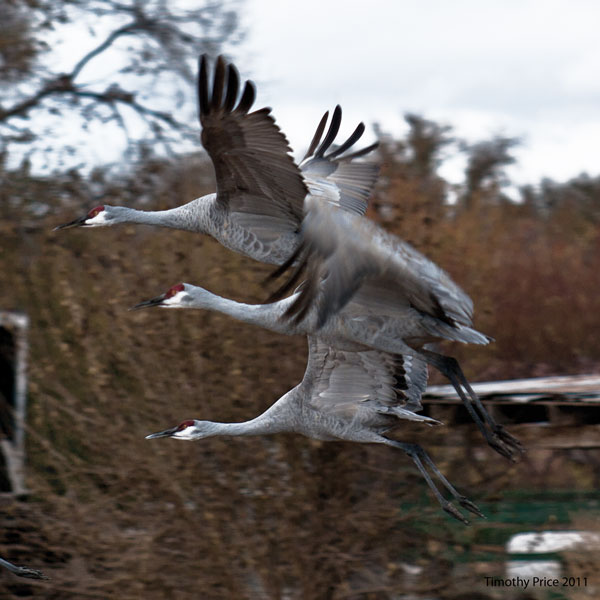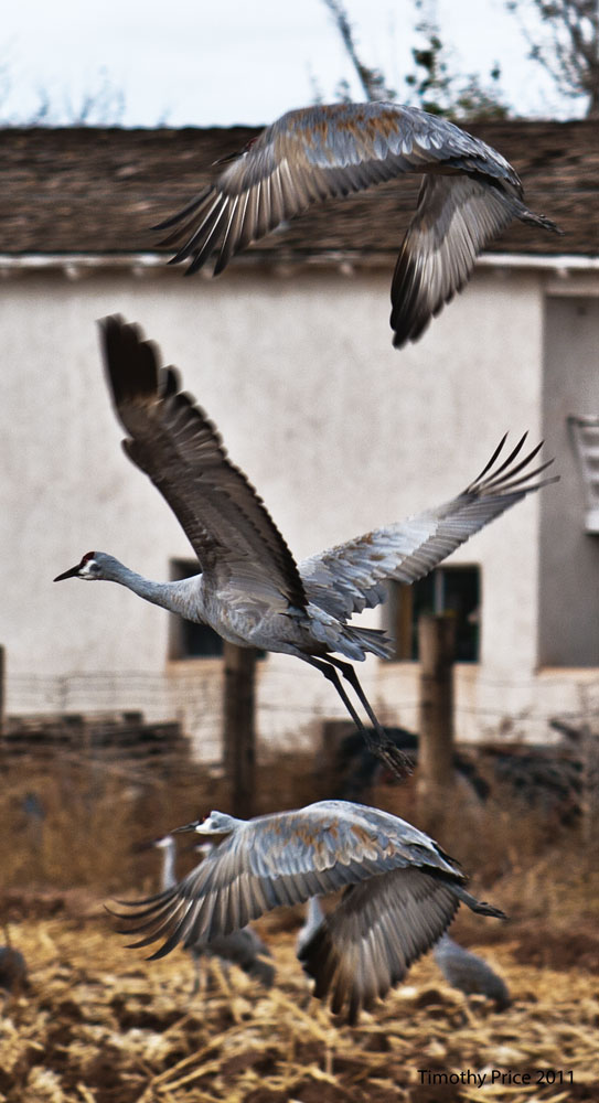 With the overcast skies drizzling rain on and off most of the afternoon, I noticed the cranes stayed in the cornfield along Dixon Road when I went out to get kitty food. After I got home and unloaded the car, I went back out with telephoto lenses and got as close to the cranes as I could before they took flight. The photos are low contrast because of the low light from the cloud cover and, in some of the photos, the birds blend into the background; however, with the various shots of the cranes in flight and a few where they are walking around, mostly watching me, I believe you get a pretty good idea of what Sandhill Cranes look like on the ground and in flight.