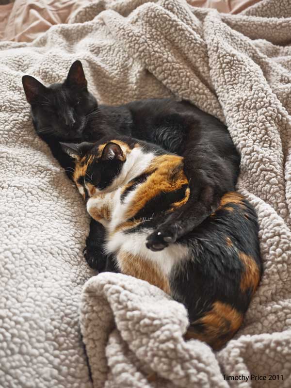 To make up for my lack of photos yesterday, I went out and got the cranes in action, a panorama of the stormy Sandias, and Rosencrantz and Diné snuggled up on the bed.