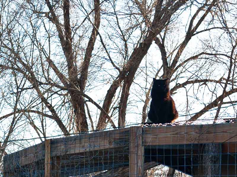 I haven’t had to work at home for quite awhile, but today I had to add a second monitor to my Macbook in order to get some serious work done. The monitor really added to the clutter on the counter. Puck was doing his imitation of a hood ornament on top of the catio this afternoon. I got the moon rising behind the trees last night.