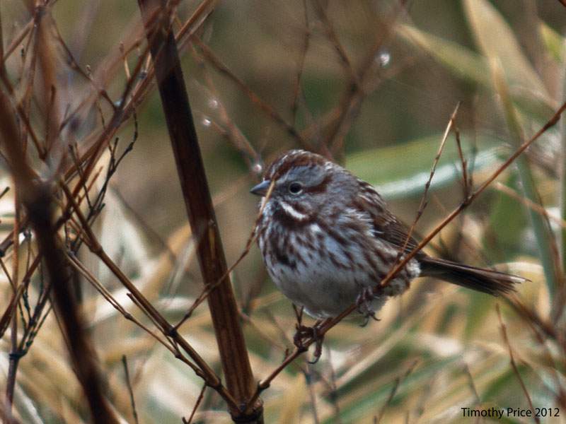 I was awakened by rain, and went outside to see the effect it was having in the pre-dawn light. The Sandias where misty through the drizzle and light cloud cover, which had turned the rain to snow, leaving the cracks and craggy spaces in the face of the mountains white. I climbed down off the roof after photographing the Sandias to find a sparrow playing at my feet. The rain fell ever so lightly as it fluttered through the vinca, before hopping onto a chimenea, where it strutted around the edge turning from one side to the other, but keeping its face toward me, as it made a quarter arc around the cast iron lip. Then it flew into the bamboo, not 10 feet from me, where it struck various poses while I photographed it. I was using my 70-200 mm ƒ/2.0 lens since it was dawn and overcast. The exposure was 1/80 sec at ƒ/2.0, ISO 100. The lens was zoomed to 200 mm.
