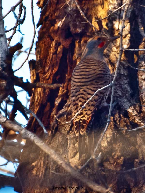What I always thought of as a woodpecker turned out to a Red Shafted Flicker, which is about the size of a common dove, and has a dove-like appearance. Unlike a dove, that will sit perfectly still on a branch or power line, this flicker flitted and hopped around the cottonwood tree searching for food for a few minutes before it flew to another branch or different tree. After doing a little research, I’m surprised this flicker is this far north this time of year. According range maps of the red and yellow shafted flickers, they breed in Canada in the spring, can be found throughout the continental US during the summer months and spend the winter months in Texas and Mexico, southwestern Arizona and Eastern California. This one was quite active in the cold rays of the late afternoon sun.