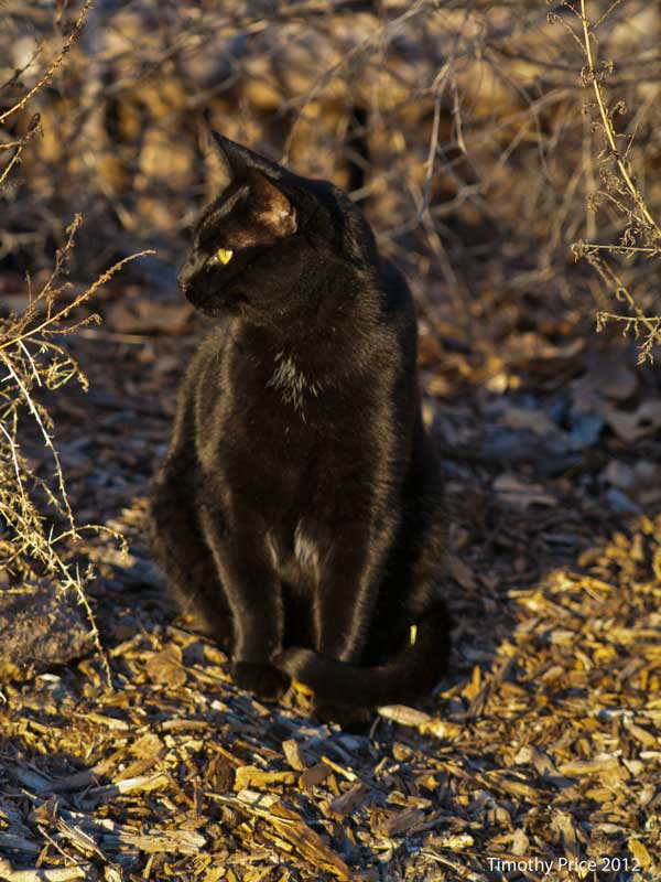 Puck likes to lay out on one of the ottomans on the deck and catch the rays that filter through the leafless trees and find their way under the canopy. Rosencrantz followed me around while I was photographing the flicker and starlings and talked to me the whole time. I think he was trying to tell me that the birds where out of reach. When I finished with the birds, I started walking back to the house, turned to look for Rosencrantz and saw him seated in a sunbeam watching Puck who was slinking around in the garden.