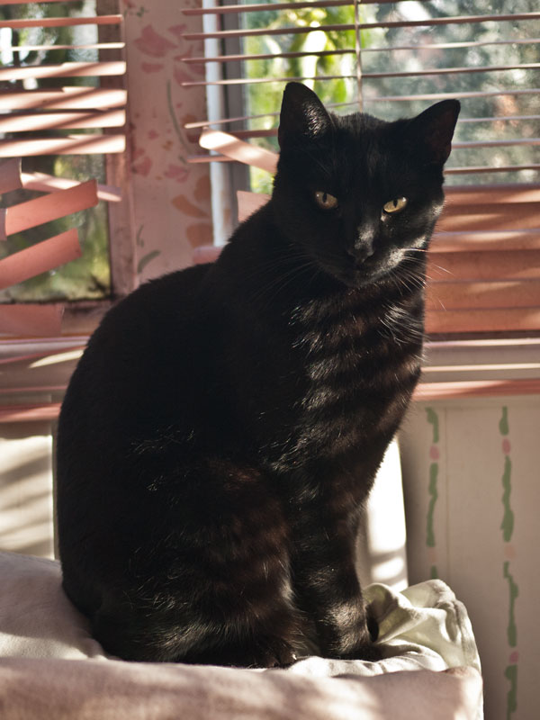 Rosencrantz had already been out in the frosty, 5 degree temperature at 7:30 am, but soon came back in and found sitting on my pillow in the sunshine streaming through the blinds much more comfortable. You can see from the bent up blinds behind him that the cats like to run through the blinds to walk along and sit on the window sills.