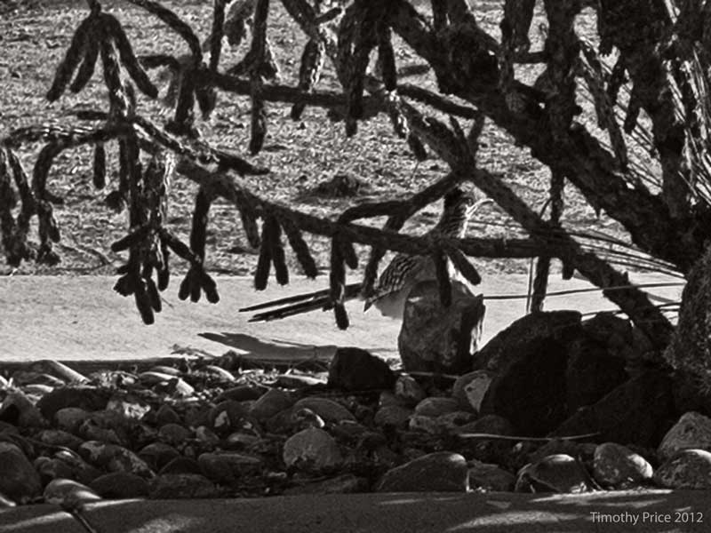 A roadrunner was sunning himself behind a catcus yesterday when I dropped Laurie off at Tristan’s. Many years ago we had an infestation of roadrunners on the property. When we were gardening, five or six roadrunners would circle around us sizing us up to see if they could make a few meal out of us. Roadrunners seem more like dinosaurs than birds to me. After a couple of years of eating all the lizards, robins and other birds in the neighborhood they moved on. I haven’t seen a roadrunner in the yard in long, long time.