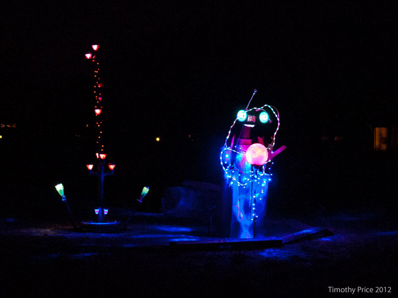 Night Art February 10, 2012 Timothy PriceLeave a comment This installation is in a yard at the top of our road. When it was installed around Christmas, I thought it was decoration for the holiday, but tonight I gave it a closer look and realized it is an installation of night art.