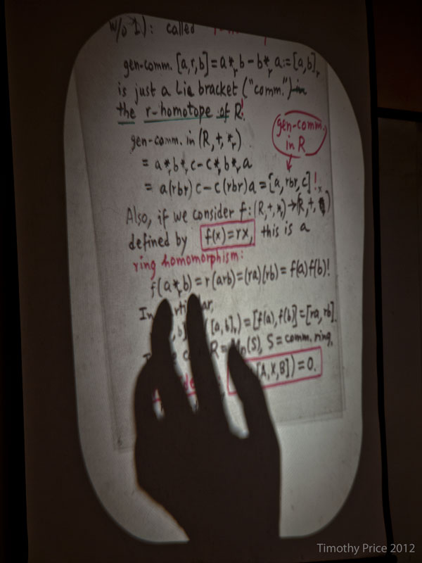 I’m in Lubbock, TX tonight. Laurie has a poster of her thesis in the Southwest Local Algebra Meeting (SLAM) held this year at Texas Tech University. We drove down with Professor Vassilev and 3 other graduate students from UNM this morning, and will drive back tomorrow afternoon. We got back fairly late from a reception tonight, so I’m only posting photos from one of the lectures and of a blackbird that was digging around in the grass with its beak.