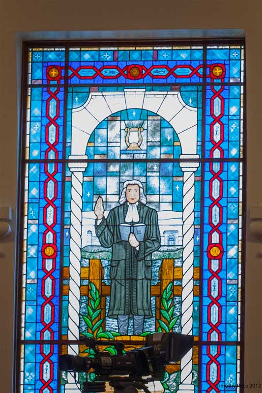 I thought it would be fun to try some stacking and stitching on a full sanctuary. Well, that proved to be quite a challenge for me and the software. The first two photos are made of stacked images of four perspectives (two high and two low), with a high and low from each side stitched vertically, then the two resulting vertical photos stitched horizontally. I attempted three upper and three lower photos, got them stitched horizontally and vertically for each side, but it was too much for the panorama software to stitch the resulting right and left sides together. The last photo is one of the video cameras they use to tape the service in front of one of the stained glass windows — an interesting juxtaposition.