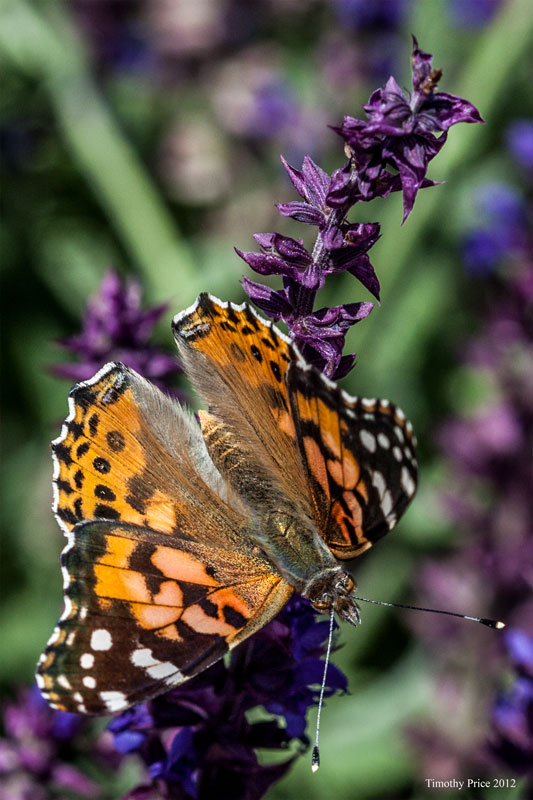 Painted ladies were fluttering around in the salvia while I was working on the canopies we park our cars under this afternoon. I guess they got used to me being there as I climbed up and down the ladder, messed with the fabric and fasteners, and cursed the wind, because when I finished fixing the canopies, I grabbed my camera and they let me get close to them with the camera.