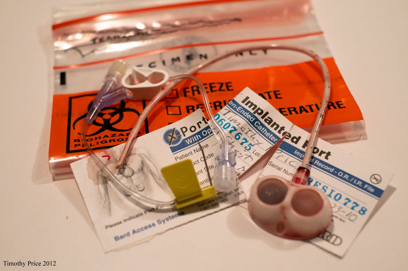 In the photo above, the port, which was implanted in my chest for two years, is the white plastic device with the two membranes and the catheter attached. The catheter was in an artery at the base of my neck at the end of my collarbone. After the Doctor pulled out the catheter, she applied pressure above my collarbone for a minute or so while the hole in the artery closed. After she got the catheter out, then she pulled out the port and sewed up the the inch and a half long incision.