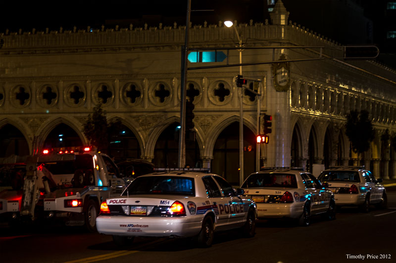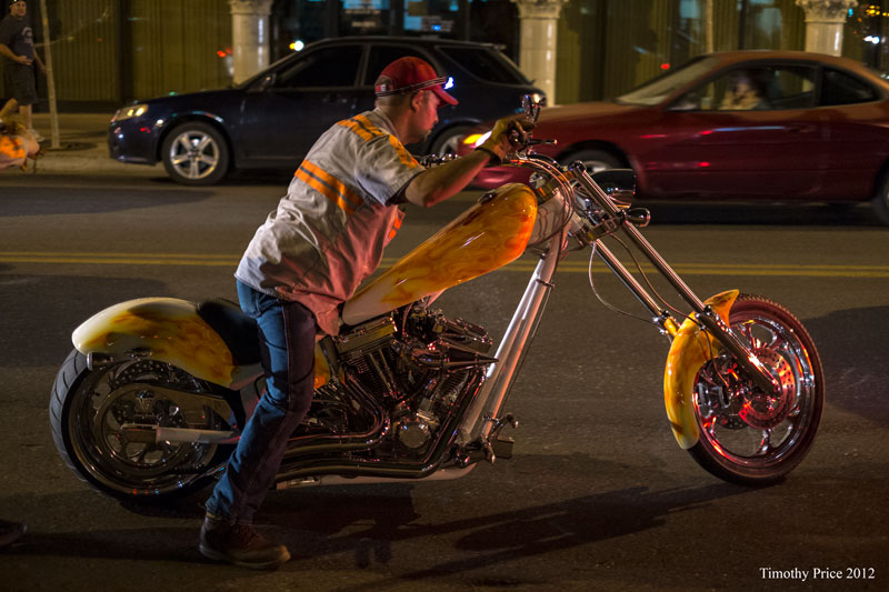 I walked out of the office at 9:15 pm tonight to find police cars parked in the middle of 3rd Street, just south of Gold, and officers shaking down various vehicles that had been routed off Central onto Gold. I assume they were simply ticketing the orange car, but the custom chopper had been impounded, as the guy on it worked for a towing companying — he pushed the chopper over to a tow truck and loaded it on the bed. I walked down to Central where the street vendors were hanging out waiting for the crowds. 9:15 was too early for downtown to really be hopping, so I headed back to the car. A saw woman was crossing the street with two little dogs as I headed to the car. I assumed she was simply out walking the dogs as I don’t believe they allow dogs in bars in Albuquerque.