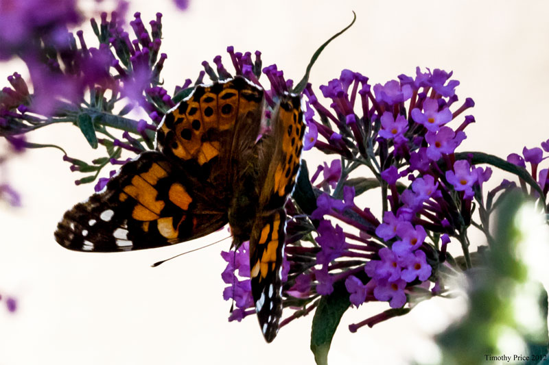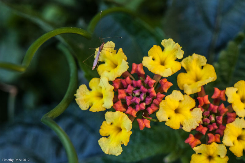 Laurie had a bug studying with her this afternoon. Below is the first yellow spotted butterfly I’ve seen. It’s tiny and has interesting double wings. The fourth photo is of tiny flowers that we have planted with corkscrew grass. There happened to be a critter hanging out on the flowers when I took the photo. The painted lady was feeding on the same butterfly bush as “Spot”, the yellow spotted butterfly, and I did some photos of them together; however, when I got the painted lady in the frame so you could tell what she was, Spot was so small it got lost in the flowers. When I got Spot framed so you could tell that it’s a butterfly, only a leg or so of the painted lady was in the frame. There are so many things that our eyes adjust for so automatically that we are hardly conscious of it, that the compositions we put together in our field of view can be almost impossible to capture in a photo.