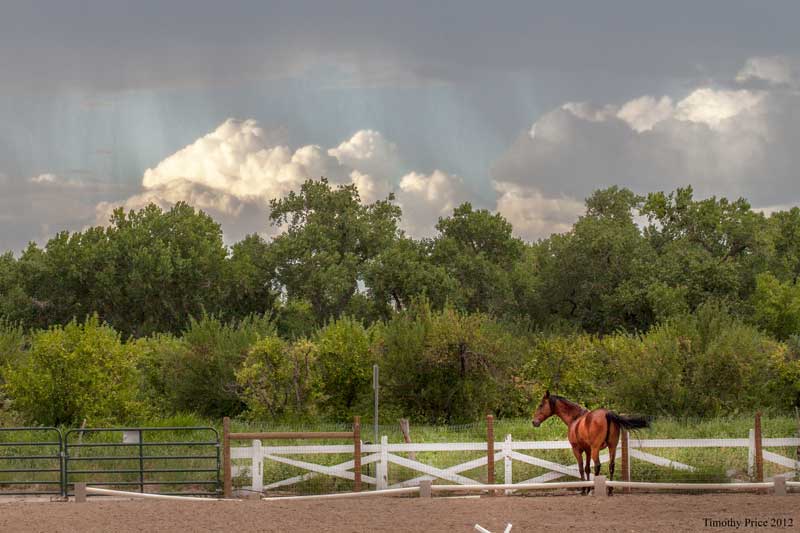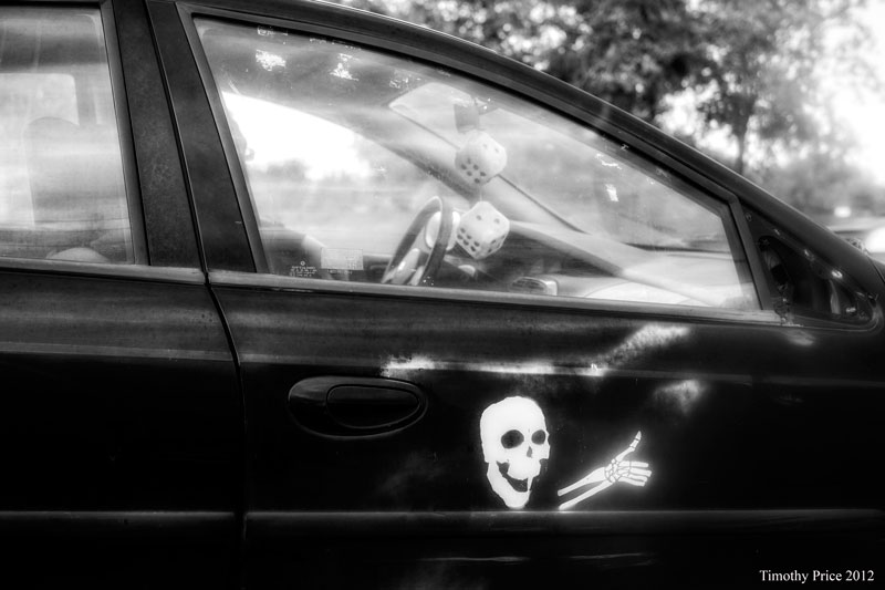 One of the horses next door had no rider as it stood and faced the storm. Both Annie, who dropped by the office this morning, and the skull on the car next to me in slow traffic, liked my Cucaracha Crunch Coffee. I think I better trade mark it before Starbucks figures it out.