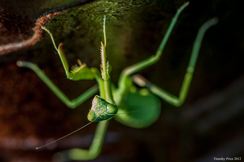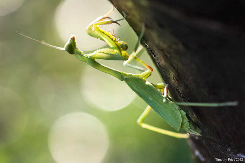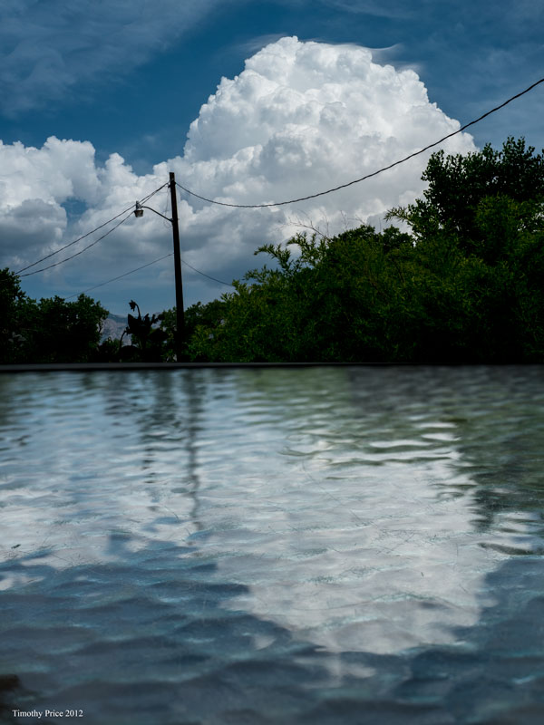 The photo of the clouds reflecting in our glass top table is our current view from the deck without the roof top and antennas in the background. Now we are going to explore the possibility of getting the power moved, so we can take down the power pole. Taboo poked a cane through the trumpet vine and akebia, and I found the Preying Mantis on the little chiminea when I was out cutting back the black bamboo at sunrise.