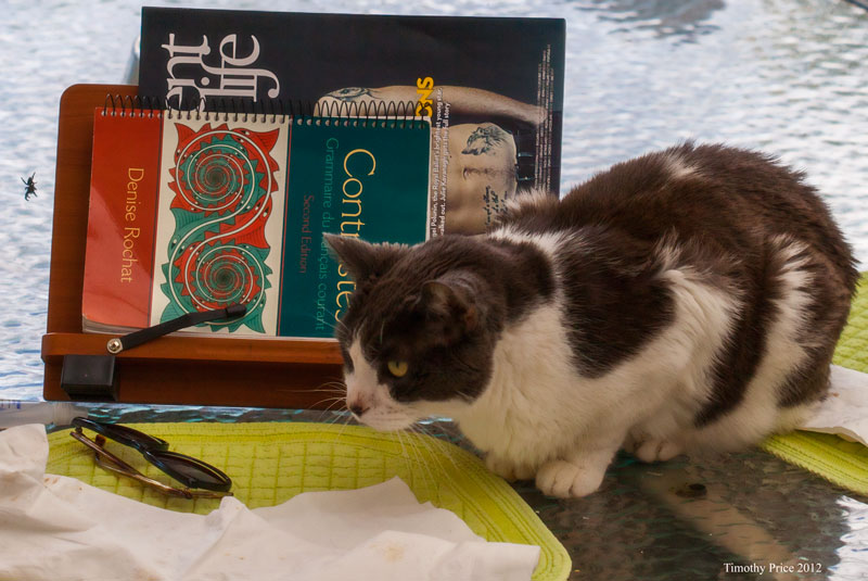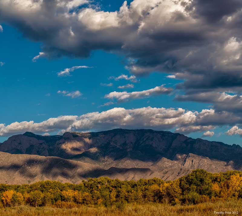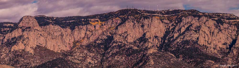 Fall colors are in — even the neighbor’s horse was sporting fall colors backlit by the low afternoon sun. Since I don’t have the time or energy to climb the face of the Sandias to get a closer look at the aspens putting on their yellow, I used my 600 mm lens to get a a little closer view of them by stitching seven vertical images together. Stretch has improved so much over the past couple of weeks, that we gave him a day off from waterboarding today. He was out contemplating French and “Intelligent Life” this afternoon — a jumping spider was hanging out with him. The last photo is a panorama of the Sandias using a 100 mm lens (2 vertical photos stitched together).