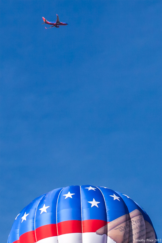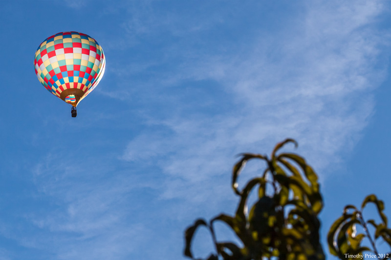 We got our first hard frost last night. I noticed a lot of water dripping off the roof over the catio this morning, so I climbed up on the roof to find it covered with thick, wet ice, and the hose to the swamp cooler split and spraying water. The split was close to where the hose connects to the swamp cooler, making it easy to cut the hose and reconnect it to the cooler to stop the leak. Otherwise, I would have had to change my clothes, crawl under the house to turn off the water to the cooler, clean up and change my clothes again (I turned off the water to the cooler after I got home this evening). After I fixed the hose, I got my camera and took photos of the balloons before heading off to work.