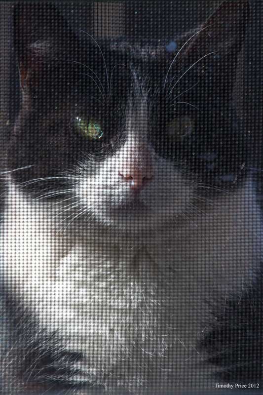 Between nights in the low 20’s and day time temps reaching into the 70’s, the rose bushes have a variety of fresh to freeze dried blooms. Mama Manx was looking in the window hoping one of us would let her in. Laurie made note of how cute she looked, while I photographed her. The kitty was very patient staring through the glass and screen until we finally let her in.