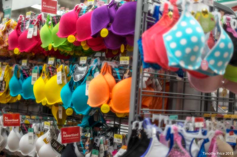 The only aisle that is a straight shot from household goods to groceries in Walmart runs right through the bras. For as much as people complain about Walmart, they are good at merchandising, because I have never seen a woman walk past the bras on her way to household or groceries and not stop and at least flip through the large variety of brightly colored, multi-patterned bras hanging on the displays. If she decides to try on a few, and she happens to have a man in tow, he will slowly die of hunger and thirst waiting for his lovely gal to find a bra that fits just right.