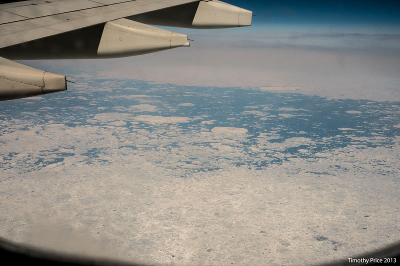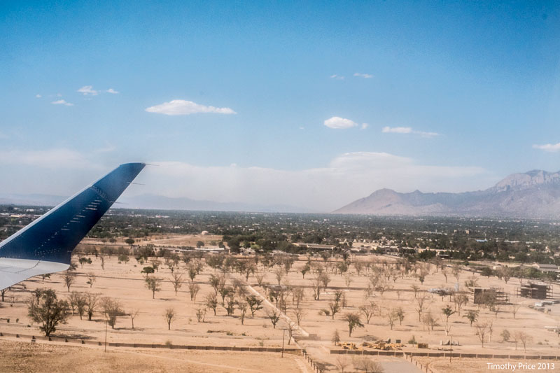 When we left Paris yesterday morning it was cloudy and 60º F, when when we touched down in Albuquerque it was sunny and 100º F — from cold and wet to hot and dry. Soon after take-off from Paris we above the clouds and it stayed cloudy until a break in the clouds over Hudson bay showed ice breaking up, and then we flew over the area of the bay that looks like land cracked with water, and it was covered with snow and ice. Then we had mostly cloud cover again until we were almost to Salt Lake City. From SLC to Albuquerque the sky had some high clouds but there was a lot of haze in the air from the fires.