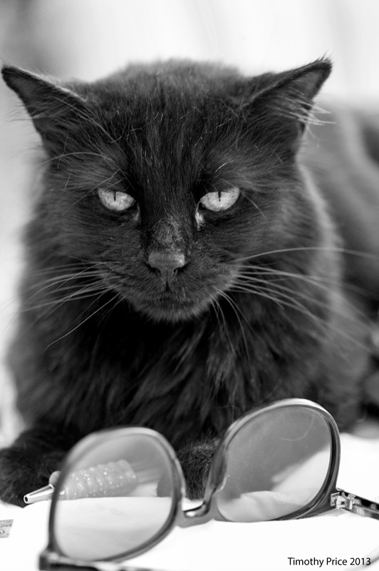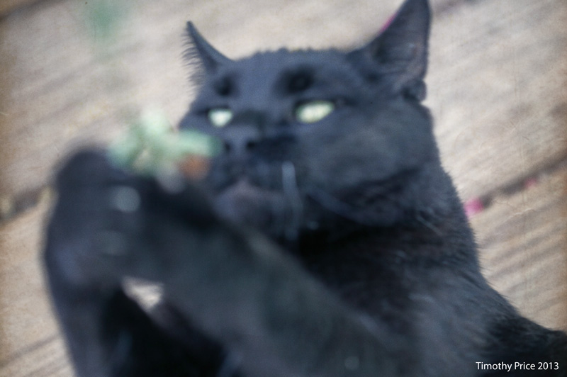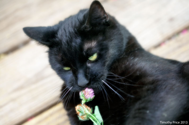 Puck is working on his memoirs, “Don’t Puck With Me”, and while he was taking a break he pestered Laurie for some attention while she was reading. Guildenstern was intently playing with clover under my chair while I sat on the deck enjoying the fine summer morning.