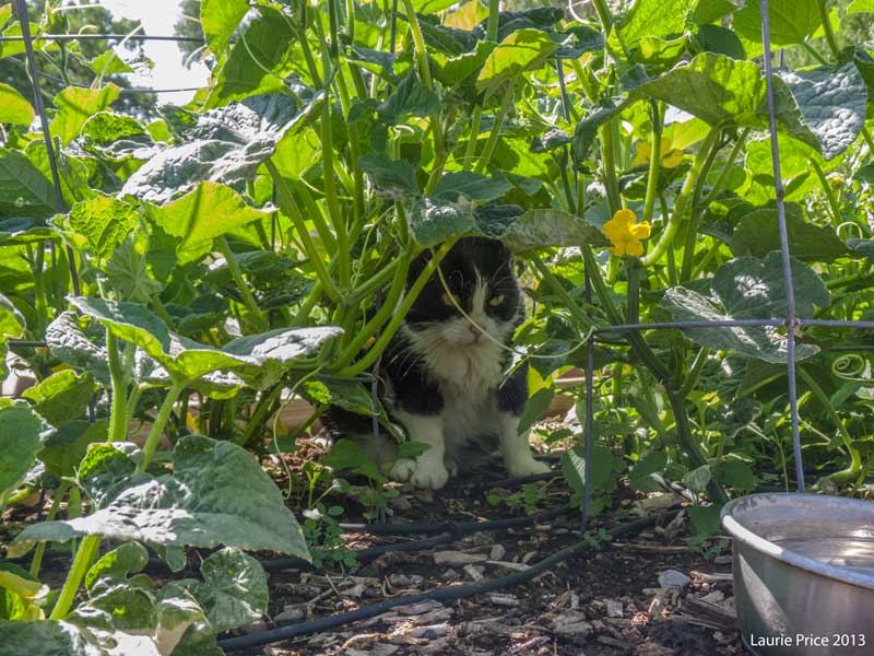 Mama Manx has a cave in the cucumber patch where she lays on the cool mulch under the shade of the cucumber leaves. When one of us gets too close to the entrance of her cucumber cave, she darts out like a moray eel, chatters at us, then retreats back into her cave.