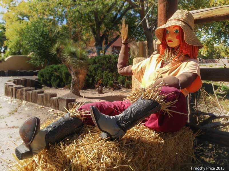 I don’t think this lovely scarecrow is very scary, but she does cut a good hay figure. Fall is in the air — I saw a couple of sandhill cranes fly over this morning, so I went out to the river before sunset and a small flock flew by. The problem is the river is running really high and fast, so the places they normally roost are underwater. The Martinez House got its color coat, and the cottonwoods are turning yellow.