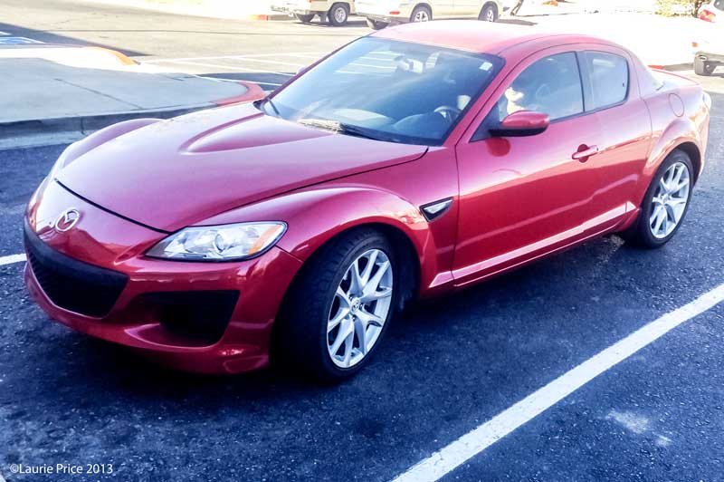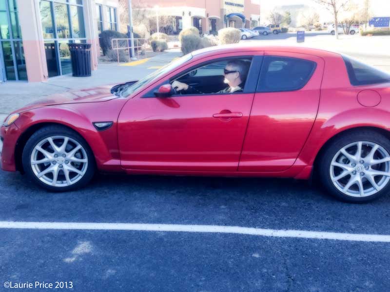 I finally replaced my 2006 Mazda 5 the insurance company totaled with with a 2009 Mazda RX8. This little beauty only has 28,500 miles, and has a 1.3 liter Renesis/Wankel rotary engine that pumps out 238 HP. The car is solid, perky, responsive and really fun to drive. It’s not as fast as Laurie’s Speed 3, but now we have two red Mazda sports cars. Laurie took these photos of me in the RX8 with her iPhone in the Credit Union’s parking lot. The car was halfway in the shade of the building so the color is a little off.