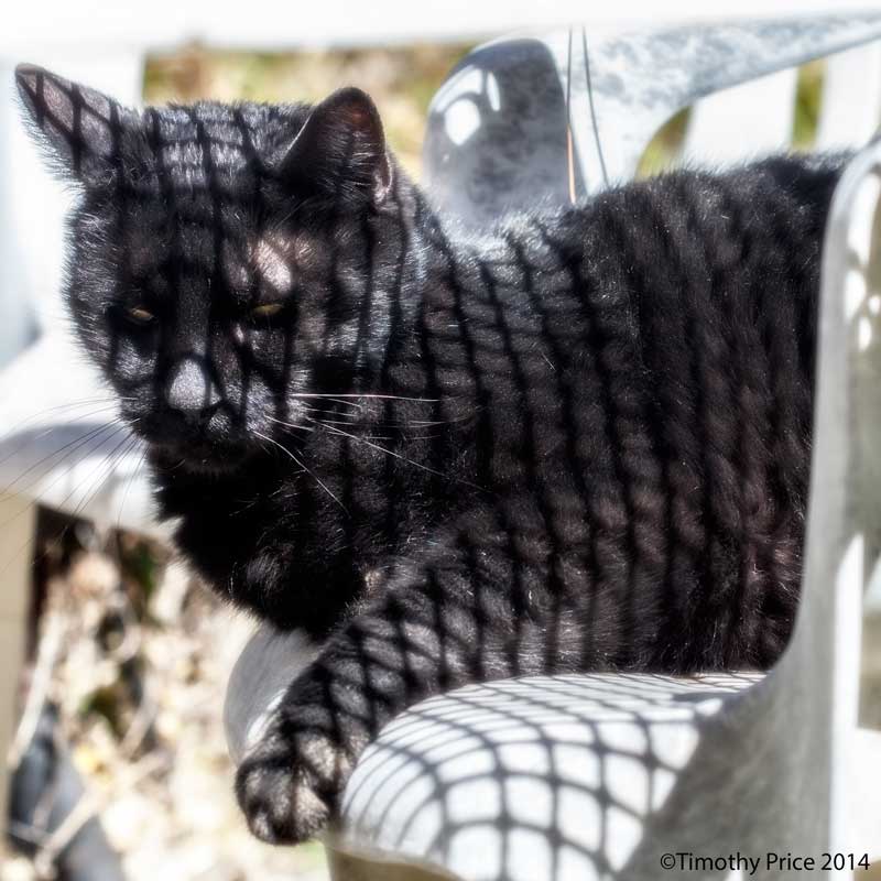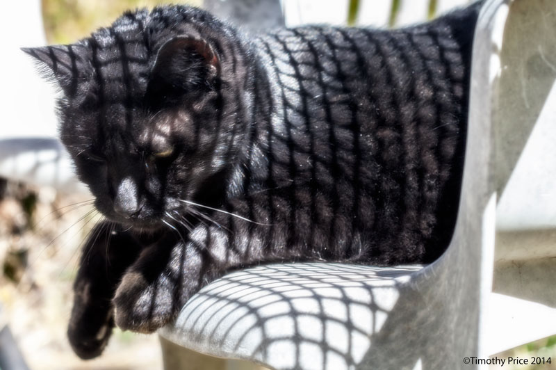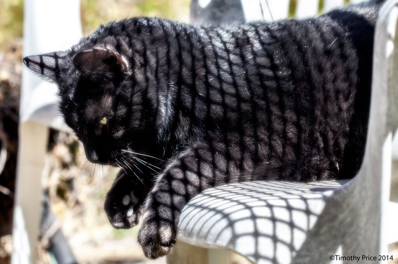 I took Guildenstern in for a checkup last week because he had become anxious, clingy, talkative and seemed to continuously move from one spot to another. It turns out he has hyperthyroid, so now I have to give him medicine twice a day. We just started the medicine on Friday, but he seems calmer already. When I give him his medicine, I open his mouth and quickly stick the tiny pill down his throat. It happens so fast, that he purrs and looks confused because he’s not sure about what happened. Guildenstern is only 13 years old, but that makes him an old man in kitty age. He was enjoying the afternoon sun from under the garden table, that made a nice grid pattern on him.