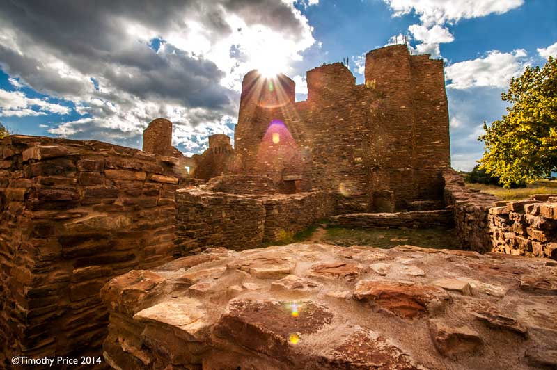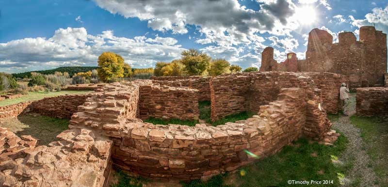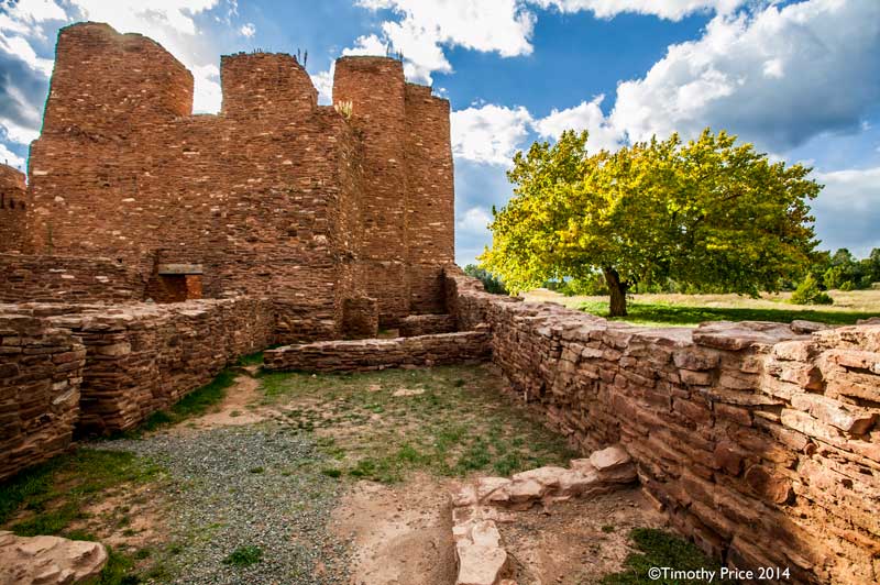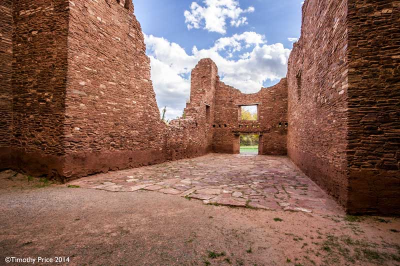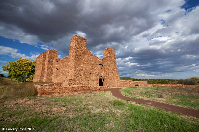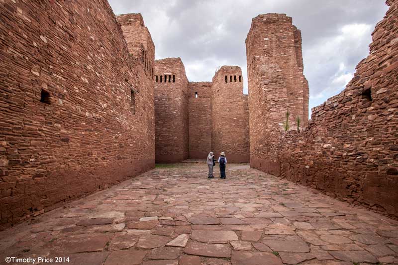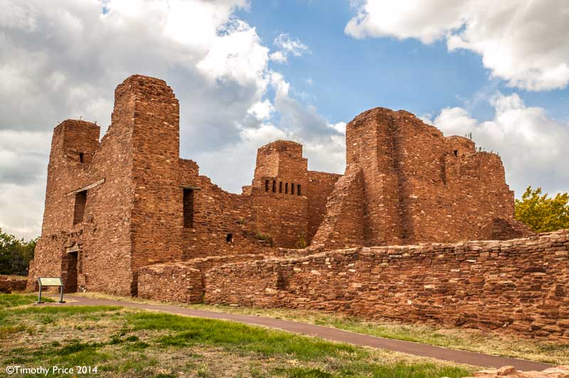 Quarai is about 10 miles straight north of Abó, and about 20 miles from Abó by taking Hwy 60 east to Mountainair, and then Hwy 55 north to Quarai. Quarai was a thriving village when the Spanish arrived at the end of the 16th Century, and was the seat of the New Mexico Inquisition during the 1600’s. Records show that the Inquisitioners in New Mexico at that time were fair and compassionate, and used the sophisticated Spanish legal system to protect the Indian’s civil and property rights.