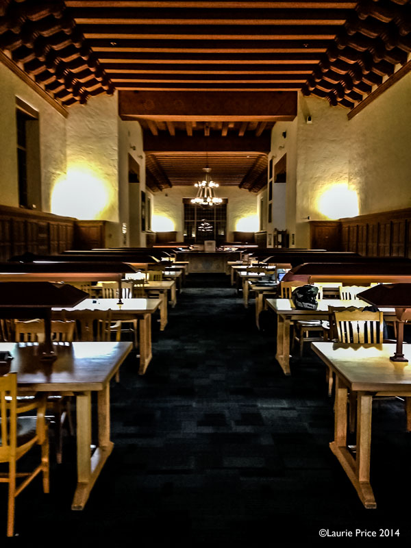 You can see from Laurie’s interior photo and my exterior photo how Zimmerman’s high ceilings and incandescent lighting creates a warm, magical atmosphere that is calming and conducive to study. Although the study tables look empty, Laurie said there are students at nearly every table, but they are either sitting close to the walls or their backpacks and computers mark their presence.