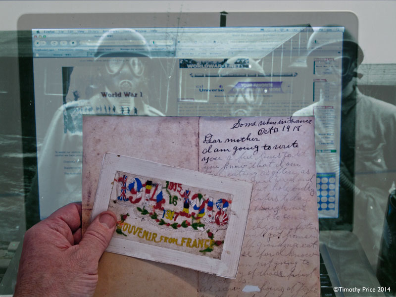 This photo would have been perfect for last Tuesday, but I only found it looking for other photos in my archives over the weekend. This is part of a series I did using old photos and letters from my grandfather in WWI, my dad in WWII and my mom between the wars. This particular composite photo includes one of the letters my grandfather had written home while stationed in France in 1918, a “souvenir” postcard with the war years embroidered in allied colors, and a photo of solders in gas masks that was part of the collection. The army would not allow the men to write where they were in France, so the letters begin “Somewhere in France”. The letters were censored, as well, with white or black marks covering “sensitive” words. When my grandfather described battles, all the details were marked out. Laurie and I spent five weeks in France in 2013. You can see my photos of France by looking up my blog entries from May 11, 2013 through June 10, 2013.