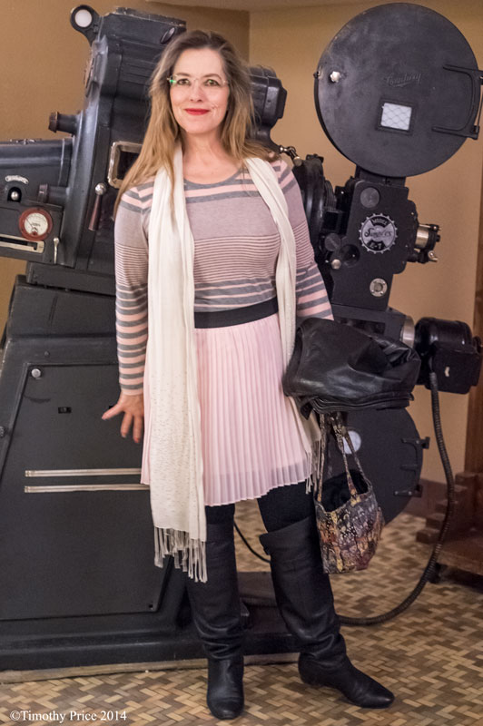 We went to the Ballet Repertory Theatre of New Mexico’s production of “The Nutcracker” last night in the historic Kimo Theater. Laurie wore her pink stripes and pleats with “Count of Monte Cristo” boots, white silk scarf, and her Harley Davidson leather jacket for the cold walk back to the car.