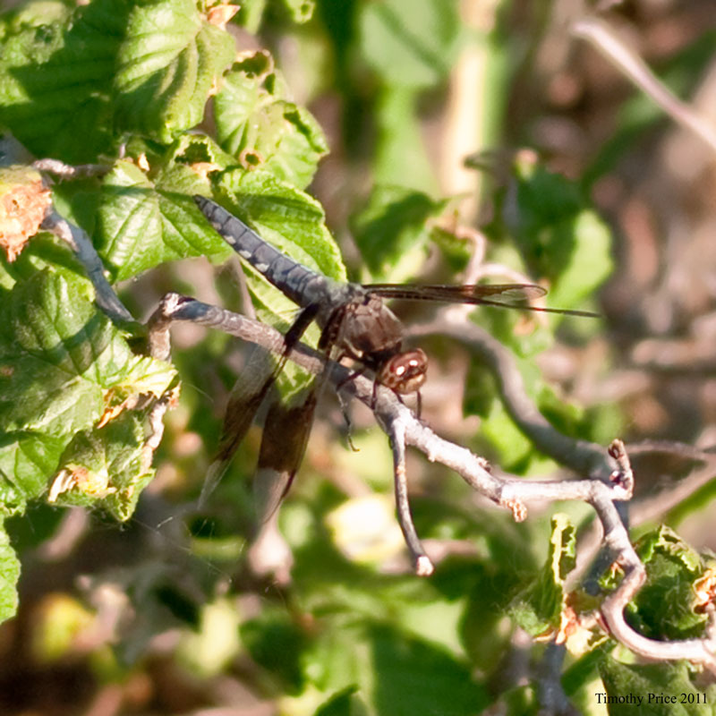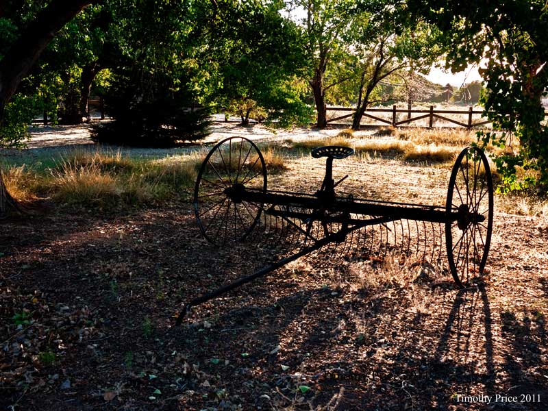 Originally posted June 11, 2011: Golden Unicorn was in good form tonight. We are finally getting more decent blooms on the roses. The Chestnut Rose’s bud is very interesting with all it’s little spikes. I got a new dragonfly on Harry Lauder’s Walking Stick. The cotton under the trees behind the rake looks a lot like snow in the low sun. I did some more tightly cropped photos that made the cotton look even more like snow, but having the rake in the foreground was much more interesting.