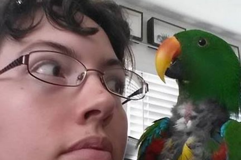 Tristan with René our Eclectus Parrot.