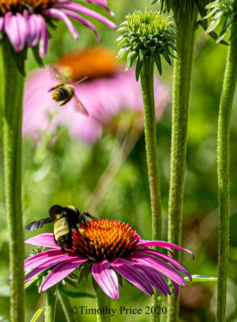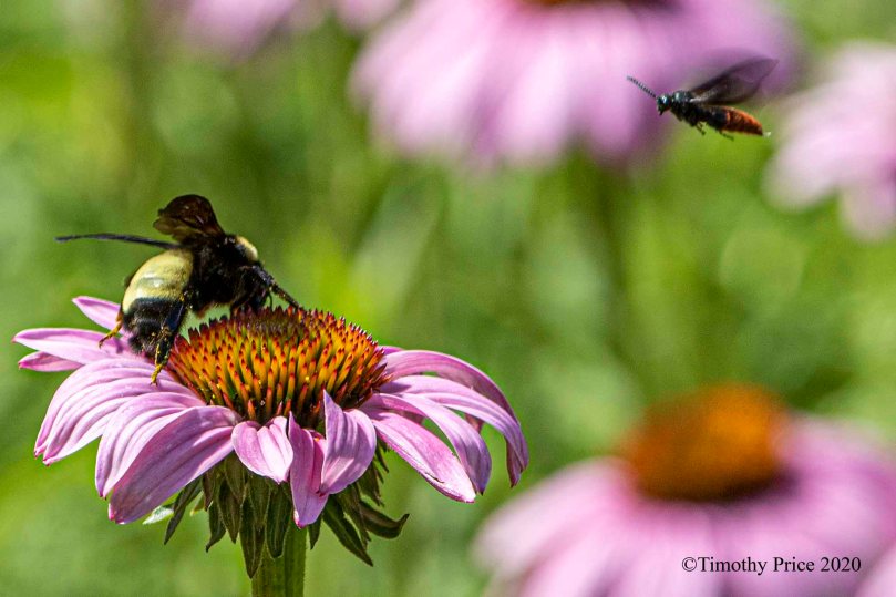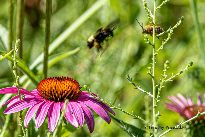 “Hey, there boy. You’re bothering me.” This poor bumblebee was trying to feed on the echinacea when other bees kept pestering it and T-boning it. I was not able to capture a T-bone, but you can see how the bumble is knocked “off-center” and ends up “not even” right after being slammed into by other flying insects.