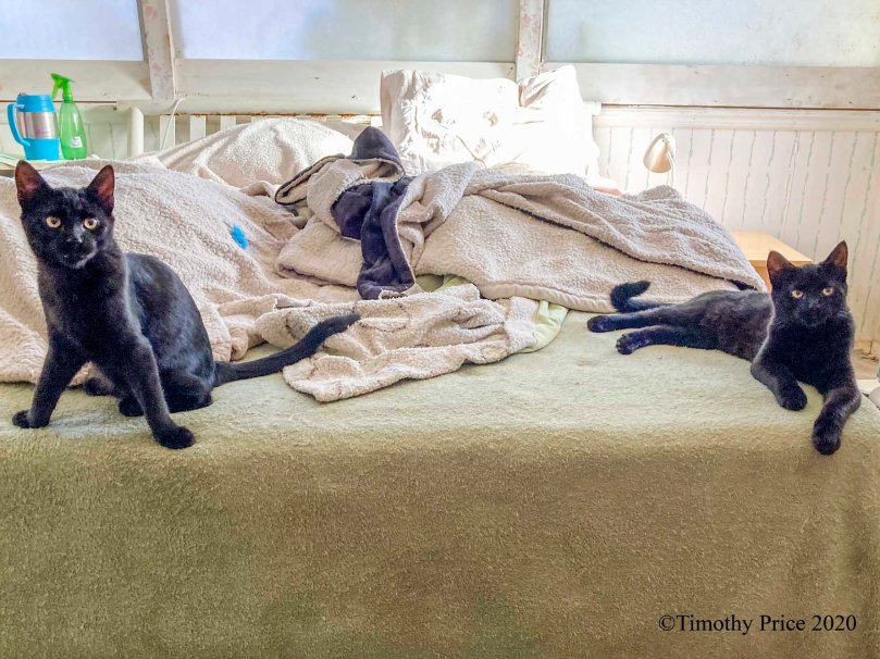 Here, still working on lowering the hissing level. If the hissing level ramps up, sometimes that will lead to a confrontation, mostly between Caitie and Pinky. And, you can see it when their coats poof out along with their tails. But, also had a few days where there’s relative calm.