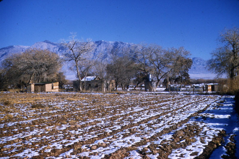 The way Spunk described the property while he was in the parallel caterverse. Our property circa 1958. The chicken shed, which is the only building left standing, is on the right. You might notice there are no towers on the Sandias. That’s an outhouse and goat shed on the left under Resa’s tree.