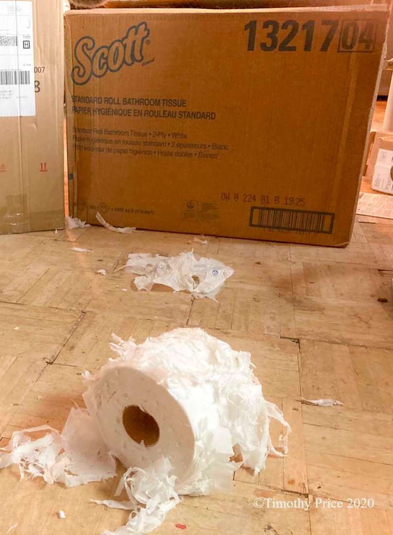 A few hours after the current very restrictive lockdown was announced that put a capacity of 25% or 75 people, whichever is smaller, in any store that was allowed to be open, people went nuts, rushed out, and bought out all the toilet paper. I ordered a box of 80 rolls of super-soft, 2-Ply, 100% Recycled Fiber Bulk Toilet Paper on-line at a reasonable price, less than Costco’s Kirkland brand. The cats, especially Spunk, Silver, and Marble, worked and worked on getting the box of toilet paper opened. When I walked into the dance room on Saturday morning November 21st, I discovered the kitties had managed to get into the box and pull out a roll of toilet paper and had started shredding it. Fortunately, one roll was enough for them — the sacrificial roll. We hadn’t realized a roll of toilet paper could be so much fun. Since then they have been slowly shredding it. Spunk, Silver, and Marble have been taking turns beating up and chewing on the roll.