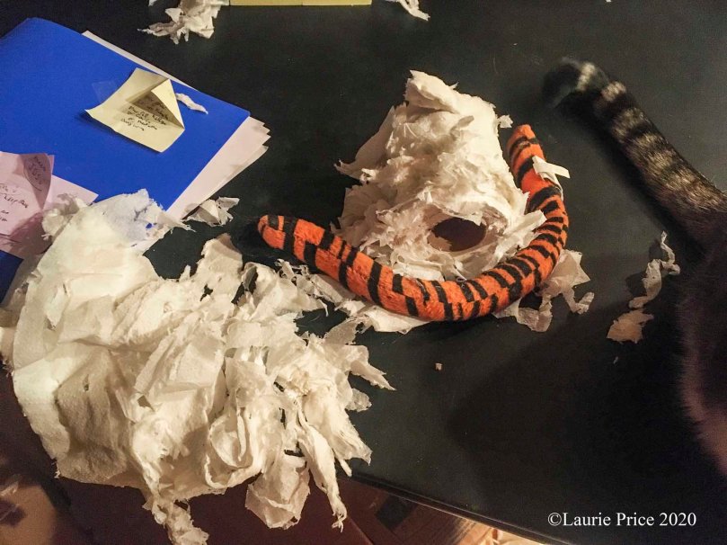 A few hours after the current very restrictive lockdown was announced that put a capacity of 25% or 75 people, whichever is smaller, in any store that was allowed to be open, people went nuts, rushed out, and bought out all the toilet paper. I ordered a box of 80 rolls of super-soft, 2-Ply, 100% Recycled Fiber Bulk Toilet Paper on-line at a reasonable price, less than Costco’s Kirkland brand. The cats, especially Spunk, Silver, and Marble, worked and worked on getting the box of toilet paper opened. When I walked into the dance room on Saturday morning November 21st, I discovered the kitties had managed to get into the box and pull out a roll of toilet paper and had started shredding it. Fortunately, one roll was enough for them — the sacrificial roll. We hadn’t realized a roll of toilet paper could be so much fun. Since then they have been slowly shredding it. Spunk, Silver, and Marble have been taking turns beating up and chewing on the roll.